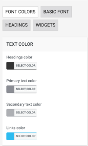 “Content Fonts” Theme Options tab allows to set color of text and specify typography settings for basic site font and headings (H1 – H6 tags), see fig. 1: